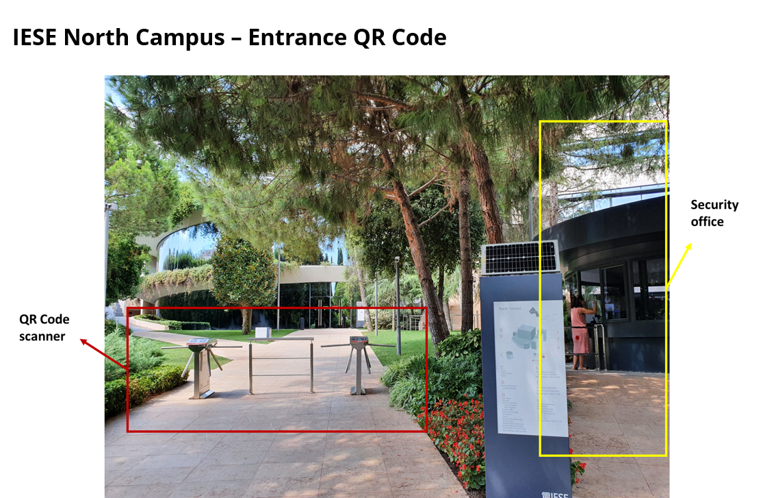 If you cannot find your QR code, when you arrive at IESE North campus, please go to the Security Office at the entrance. They will need your email address to give you access to the campus.